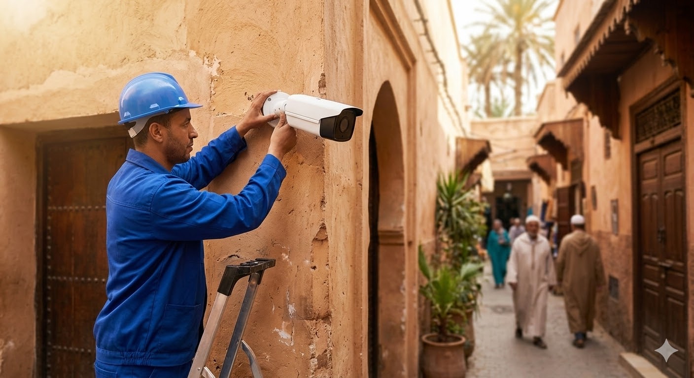 Découvrez en images notre savoir-faire. Nous installons des systèmes de vidéosurveillance performants et discrets pour villas, riads et commerces, en totale conformité avec la loi marocaine.